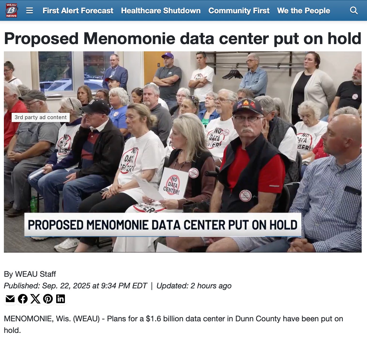 screenshot of tv report from WEAU in Wisconsin showing people with t-shirts, buttons, and signs that read no data center with the red circle and cross symbol over the words.